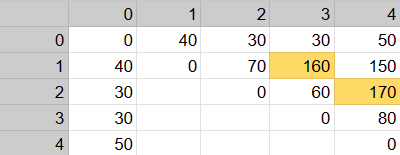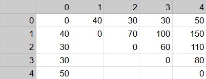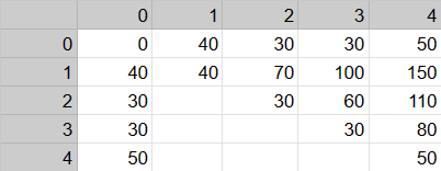 [40, 30, 30, 50]을 이용해 풀이를 진행하겠다. - 2차원 배열에 각 값과 들어온 이후 누적합을 저장한다.