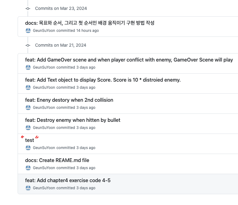 - pull request에 익숙해지려 PR을 하는 방식으로 여러 번 push했다.