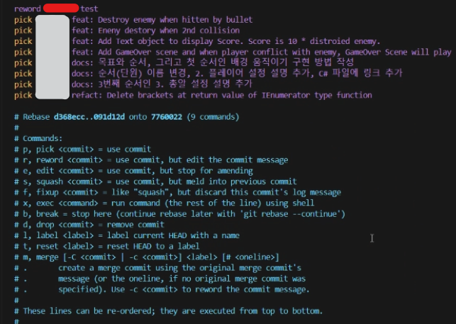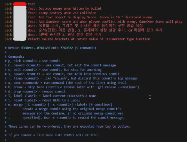 $ git rebase -i [HASH_KEY]- 위 명령어를 입력하면 앞서 말한 것처럼 다음 기록부터 보인다.