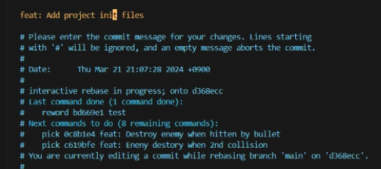 - 이제 우리는 해당 commit massage를 바꾸겠다고 선언했다. 해당 파일을 저장하고 종료하면 아래와 같은 화면이 나온다.
