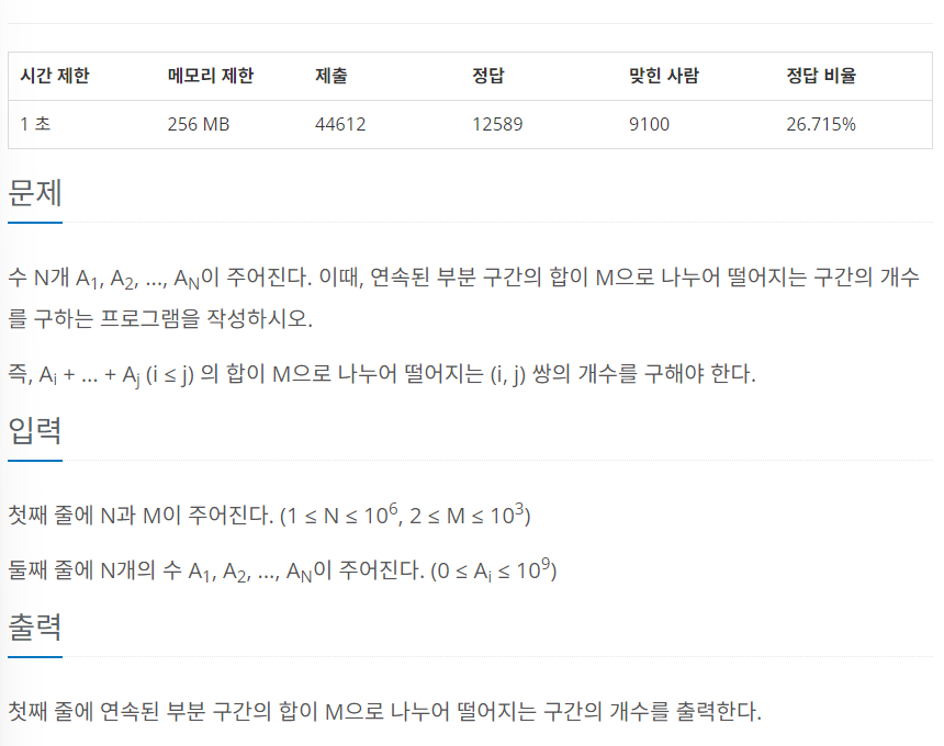 - 길이 n의 배열에서 부분합이 m으로 나누어 떨어지는 개수를 출력하는 문제.
